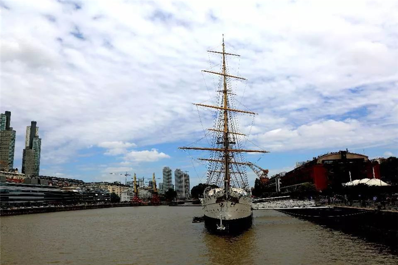 阿根廷首都布宜諾斯艾利斯的馬德羅港是兩個(gè)航海博物館的所在地,我曾去過其中之一——建于1890年,于1897年下水,于1960年退役的薩米恩托號護(hù)衛(wèi)艦。(以“薩米恩托”命名,是為了致敬阿根廷海軍學(xué)院創(chuàng)始人薩米恩托總統(tǒng)。)在1899至1938年間,這艘護(hù)衛(wèi)艦曾經(jīng)歷了37次國際航行。船體為鋼制,船艙以木材和銅裝飾,保留了船長和船員的軍服、航海圖、手跡、獸皮和作戰(zhàn)及生活用品,可以看到當(dāng)時(shí)船員的部分生活場景被再現(xiàn)。傍晚時(shí)分,微風(fēng)徐徐,登上甲板,三根桅桿下和船頭具有阿根廷象征的雕像前,游客們爭相合影留念,孩子們眼睛里的是滿天霞光,更是希望的曙光。