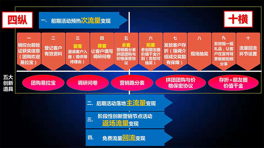 本次課程,由九龍辰品聯(lián)合創(chuàng)始人兼CEO、中國房地產(chǎn)營銷第一人,洪鳴洪院長主講。洪院長在本次課程中舉了三個(gè)跨界營銷的案例(娃娃機(jī)、健身房、南通五金機(jī)電城)詳細(xì)解釋如何低成本撬動(dòng)全渠道聯(lián)盟營銷進(jìn)行項(xiàng)目導(dǎo)客。以及項(xiàng)目導(dǎo)客之后,案場如何進(jìn)行留客、篩客、殺客、拓客的流程化步驟,幫助案場更有效的導(dǎo)客和促進(jìn)成交。